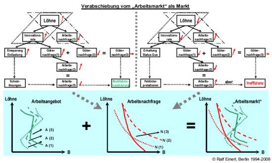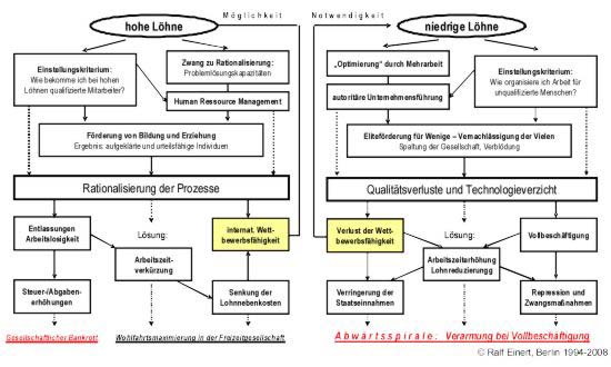 Die für das Kunstwerk speziell ausgewählten beiden Studien behandeln die Auswirkung der Lohnhöhe aus zwei verschiedenen Perspektiven. Beide Perspektiven führen zu dem Ergebnis, dass sich hohe und niedrige Löhne jeweils positiv verstärken; und zwar in dem Sinne, dass hohe Löhne weitere Lohnerhöhungen ermöglichen und niedrige Löhne notwendigerweise weitere Lohnsenkungen nach sich ziehen. Hohe Löhne führen in Verbindung mit kurzen Arbeitszeiten zur Wohlfahrtsmaximierung in der Freizeitgesellschaft. Mehr zu dieser banal und absurd klingenden Aussage finden Sie in dem wirtschaftspolitischen Teil: Kapitel 6 (Lohnspirale) und Kapitel 8 (Arbeitsmarkt).